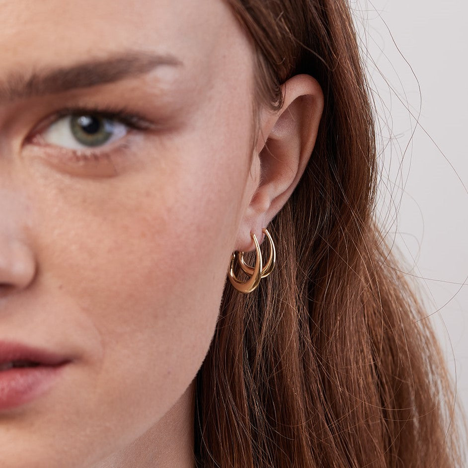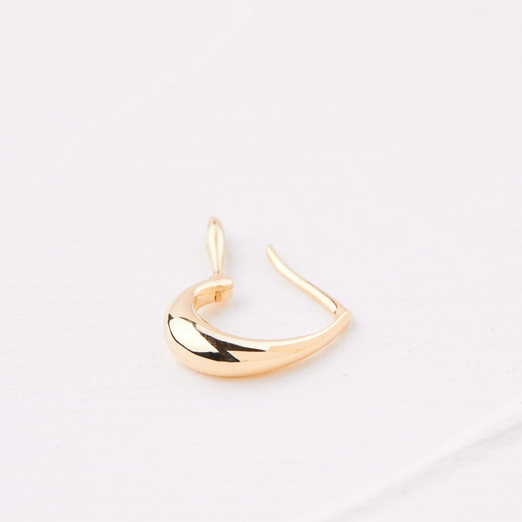 A pair of pear hoop earrings made of gold and designed in a feminine way that flatters the face.
