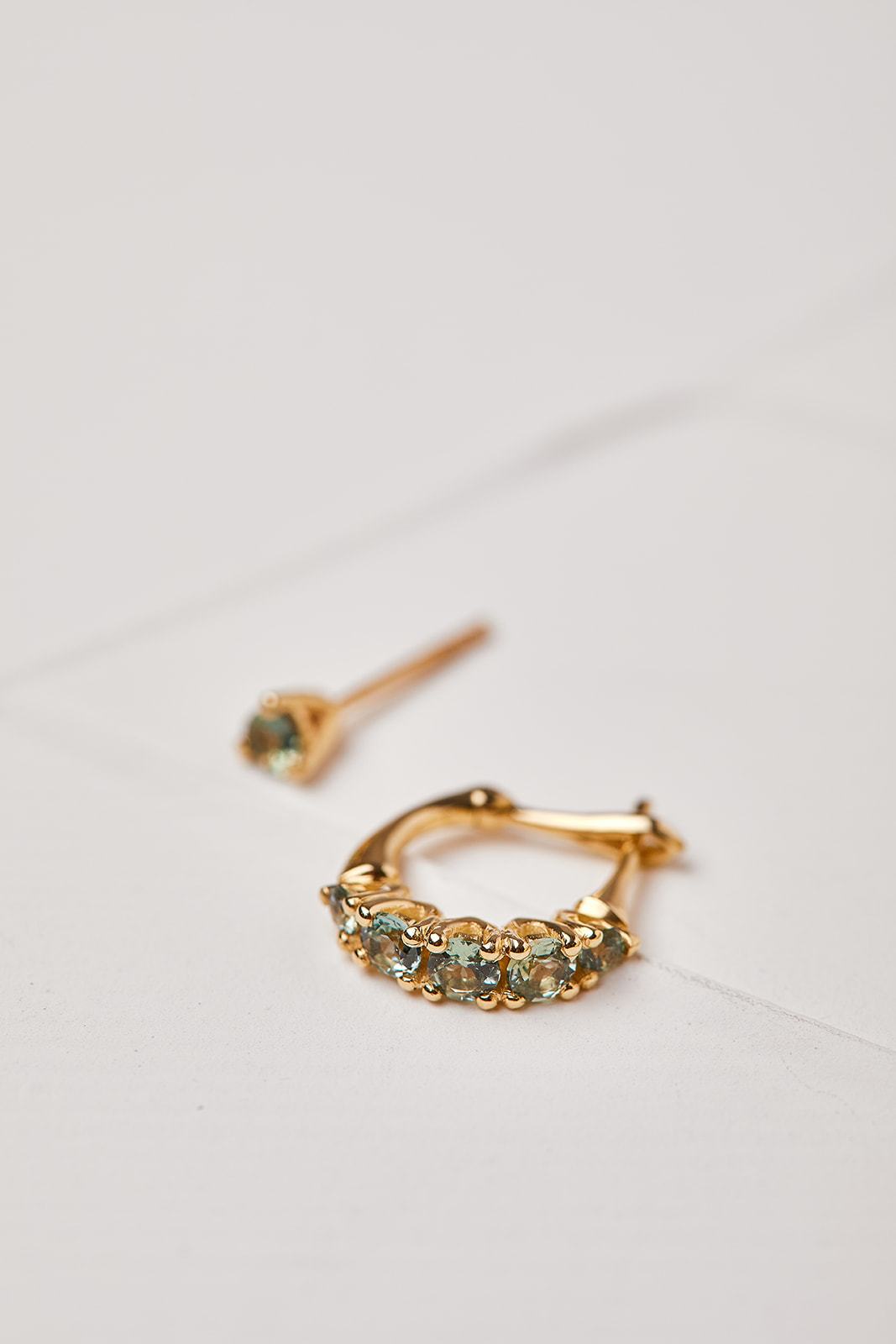 The olive tree earrings are a pair of gold earrings studded with sapphires.