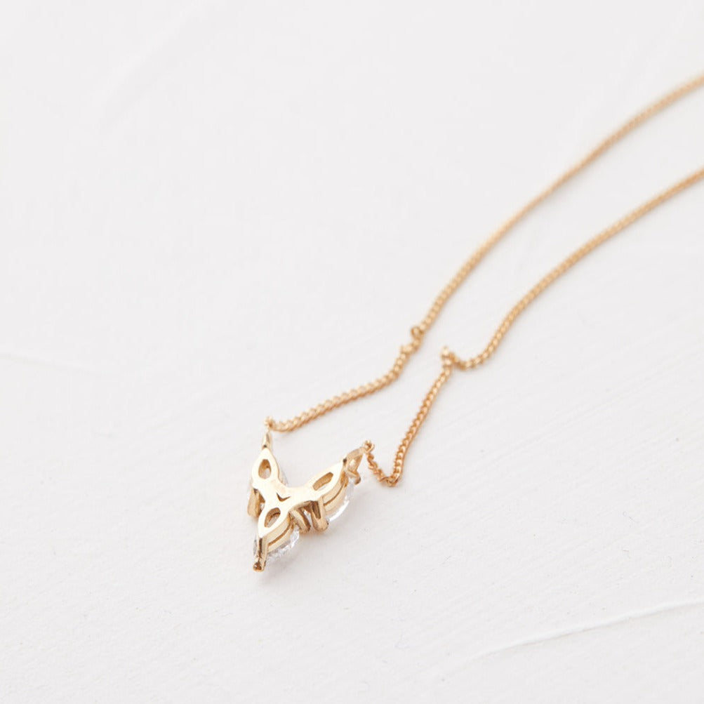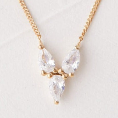 A diamond spring necklace is a gold chain set with three drop-cut diamonds.